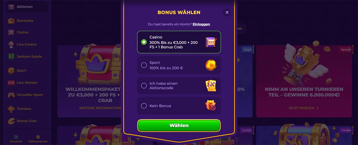 - Bonusaktivierung (100% bis 750$ + 200 Freispiele)
