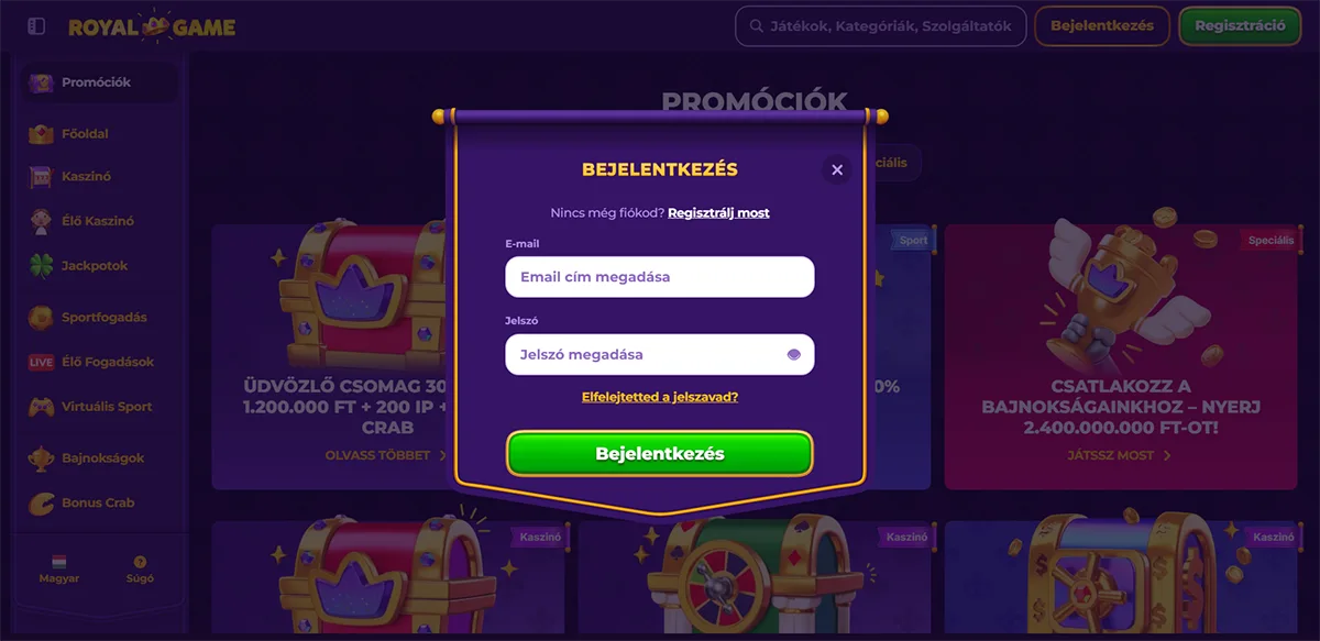 A regisztráció megkezdéséhez látogassuk meg a Royal Game Casino hivatalos weboldalát. A "Regisztráció" gombra kattintva indíthatjuk el a folyamatot.
